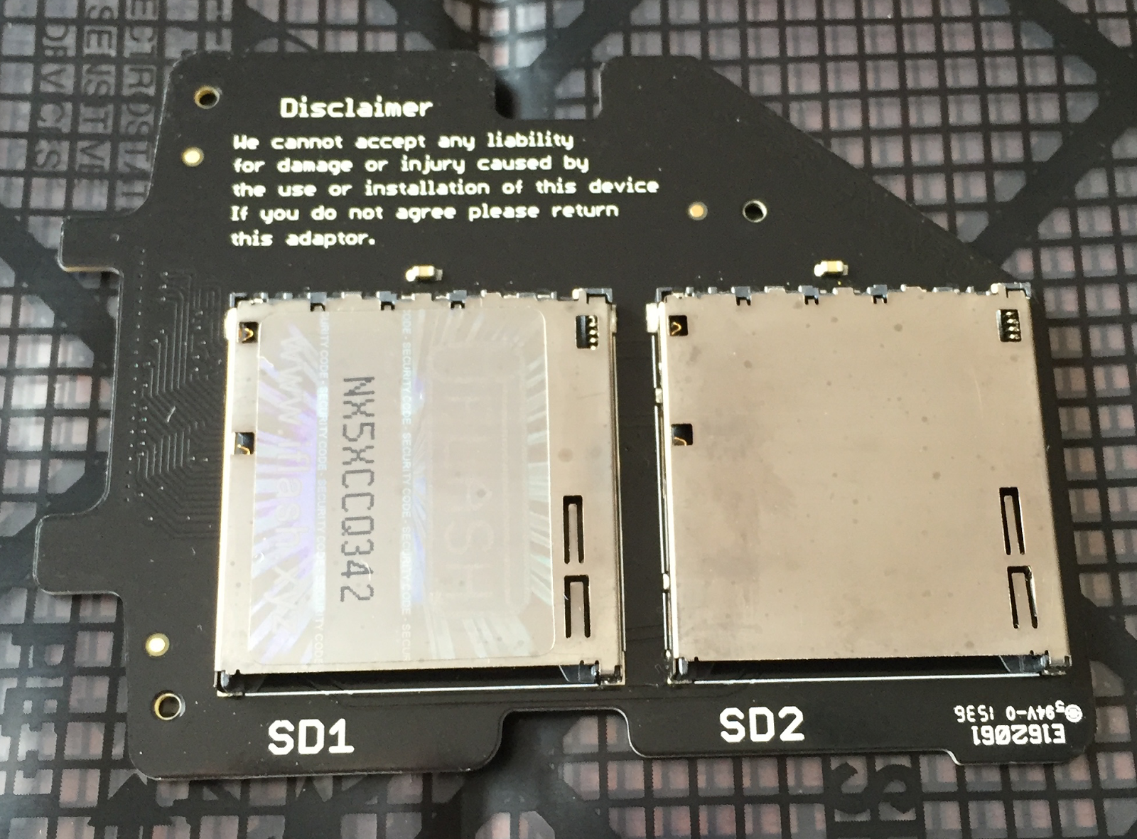 ipodのHDDはおそらくSATA規格で接続されてるようですが、それをSDカードへ変換してくれるアダプタ。責任とらんぞって免責事項が記載してあります。
